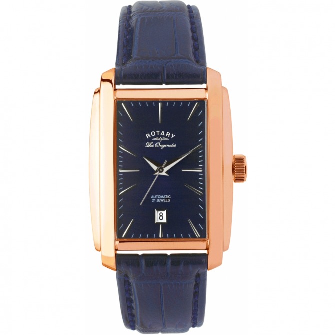 This handsome Gents Rotary watch from their Les Originales range is produced from stainless steel with a rose gold plate & is powered by an automatic movement. The Watch is fastened with a blue leather strap and has a blue dial. The watch has a date function.