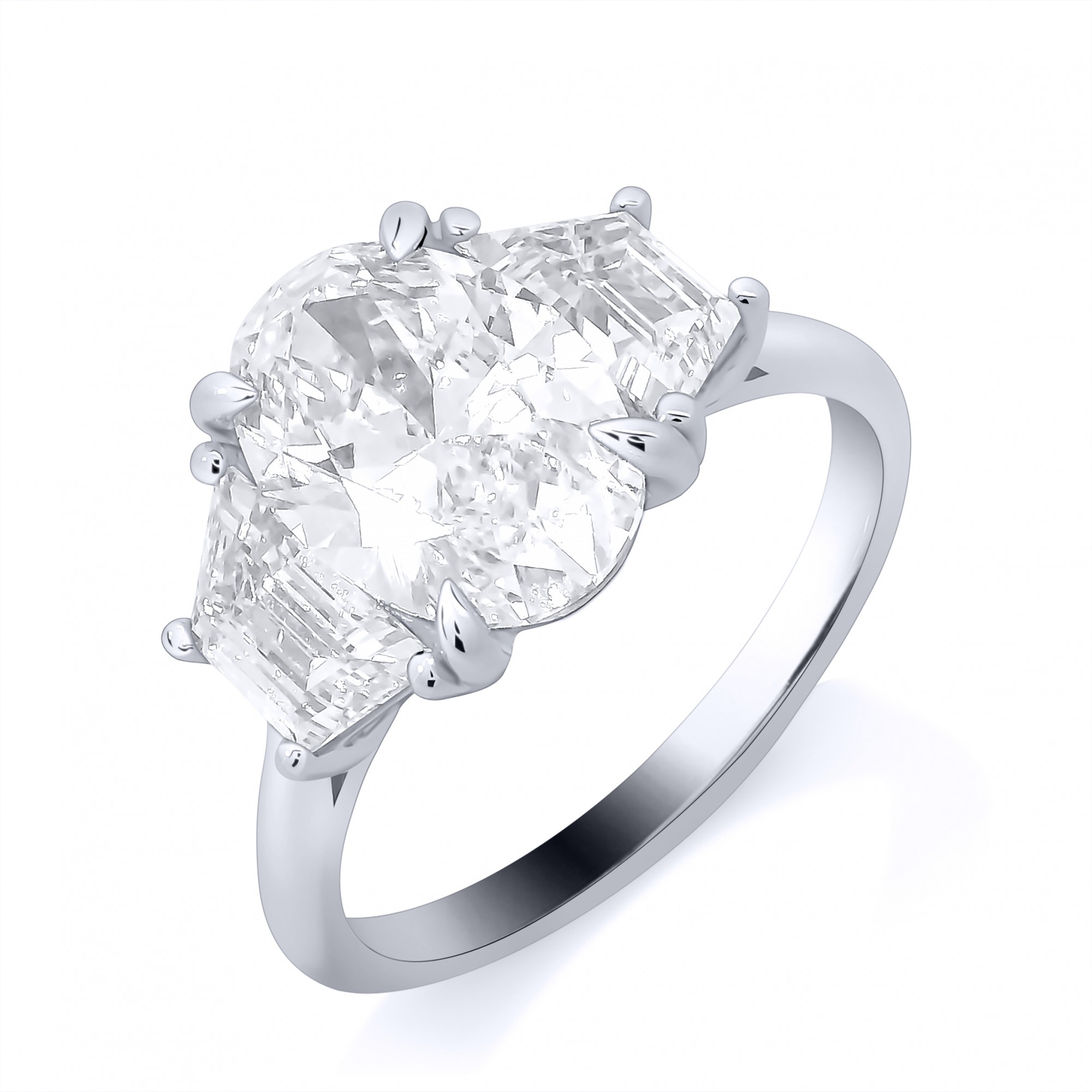 Oval cut lab grown diamond with two trapezoid cut side stones in a claw setting, mounted on a platinum ring. E. VS1 2.01ct.