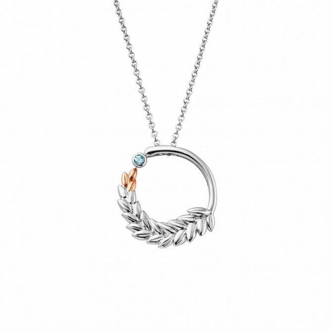 Queen Elizabeth II’s coronation gown enchanted a watching nation with intricate gold lace filigree and embroidered ears of wheat and olive branches – symbols of prosperity and peace. Celebrating that hopeful sentiment, our Lilibet Silver and Sky Blue Topaz Circular Pendant features a sterling silver and 9ct rose gold ear of wheat arcing towards a sparkling sky blue topaz gemstone. A wonderful tribute to a beloved monarch.