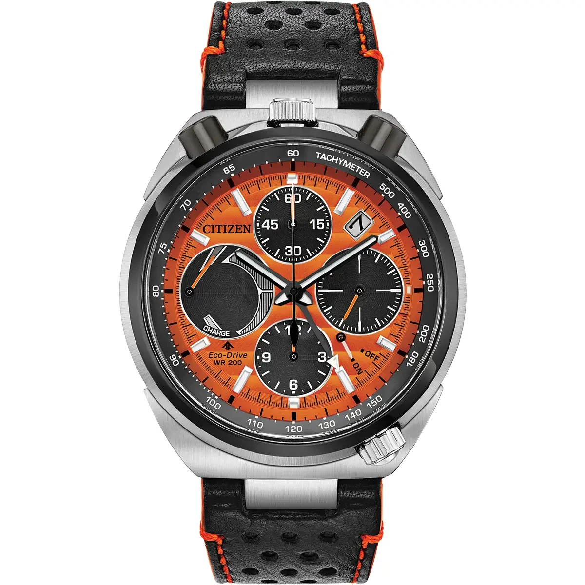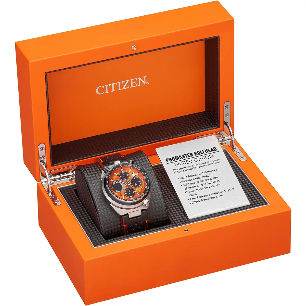 The Limited Edition Promaster Bullhead Racing Chronograph is a high-performance timepiece with an undeniably distinct design that will stand out on your wrist. Inspired by the original Citizen Bullhead from 1973, this watch features a two-tone stainless-steel case secured by a sleek black leather strap with orange contrast stitching. With an orange dial, the layout design makes use of four black sub-dials accented with orange hands to create a dynamic and sporty aesthetic. Additional features of the timepiece include a hand assembled movement, a 1/5 second flyback chronograph that can measure up to 12 hours, an alarm, a power reserve indicator, and date display. Maintaining the robust standards of the Promaster Collection, this watch is water resistant up to 200 metres. Powered by Citizen’s proprietary Eco-Drive technology to provide light-powered vitality continuously and sustainably without ever needing a battery. Presented in a special edition box, this watch is limited to 1,973 pieces worldwide.