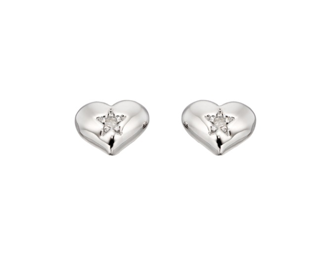 Little silver heart-shaped children’s earrings featuring Cosmo’s engraved star, set with a sparkling diamond.