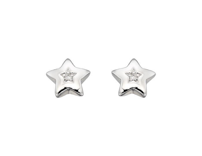 Children’s diamond earrings featuring Cosmo’s Little Silver Star, set with a sparkling diamond. A wonderful birthday gift.