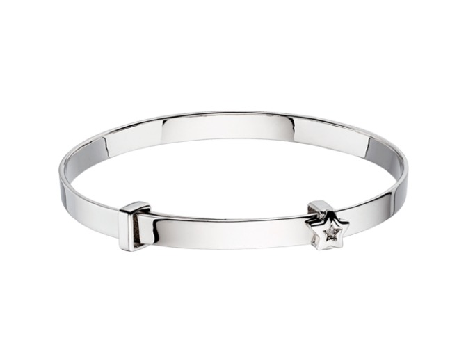 Cosmo’s star. This Diamond Star Baby Bangle is engraveable and features a star set with a real sparkling Diamond. A perfect modern twist on a classic gift for newborns and christenings. It is adjustable and therefore suitable for ages newborn through to 6 years old.