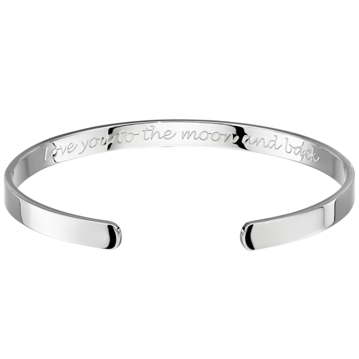 Our new Neoma Bangle is beautiful in its simplicity. Made from Sterling Silver it is solid and built to last as the perfect keepsake. The silver is malleable so the bangle can be slightly adjusted to fit various wrist sizes by gently squeezing the ends closer or opening them slightly wider. Engraved on the inside with Love You to the Moon and Back you can also create your own personalised baby bangle by engraving the outside with a special name or date. Pair with our adult’s version of the Selene Bangle for our all-new perfect Mummy & Me set, or just on its own for a special little girl on her birthday or for being your flower girl or just the best big sister.