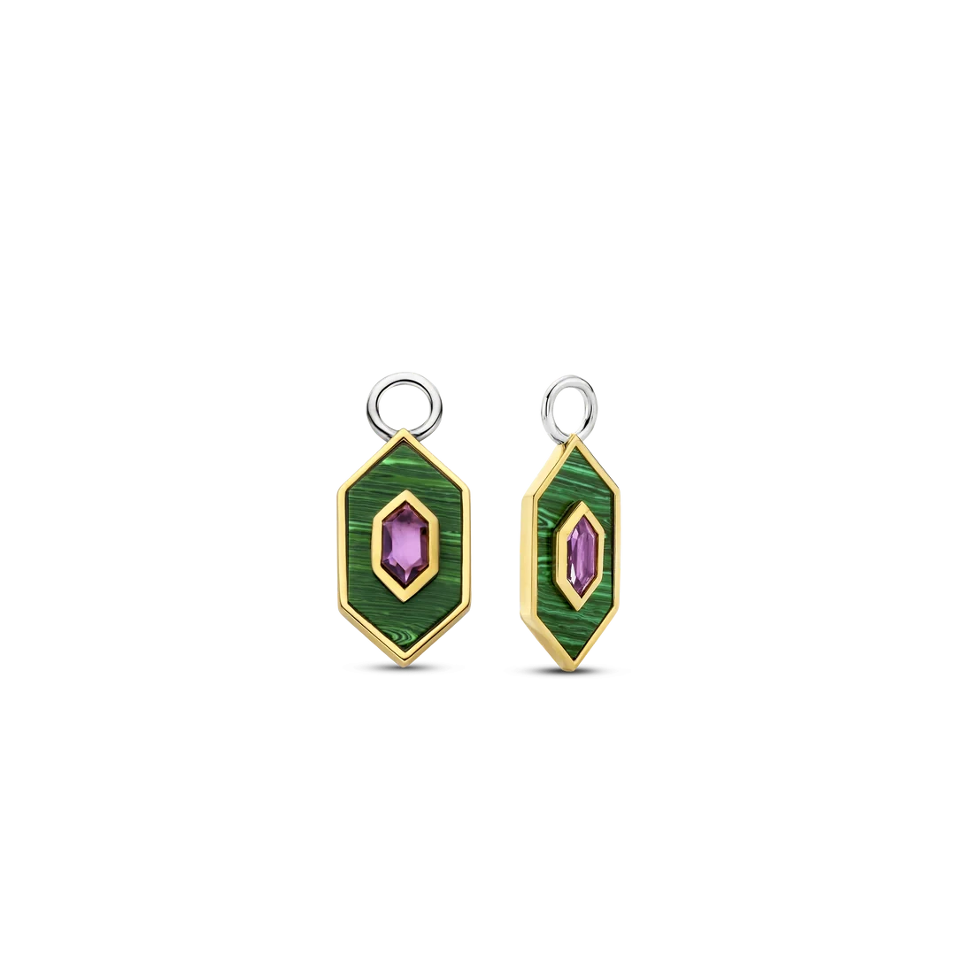 These TI SENTO gold-plated ear charms 9271MA showcase enchanting malachite green stones and charming amethyst purple stones handset in yellow gold-plated settings. The stones are securely set within gold-plated geometric frames, enhancing their allure and adding a touch of opulence. While clashing at first sight, amethyst purple and malachite green combine beautifully together. The vibrant amethyst purple stones add a pop of colour and sophistication while the malachite green shades exude luxury and magic. These opulent ear charms are crafted from the highest quality 925 sterling silver and then plated with yellow gold for an opulent and warm touch. Wear them on their own, hang them to your favourite hoops, combine them with others; there are no rules, just endless possibilities. All our ear charms are nickel-free and hypoallergenic.