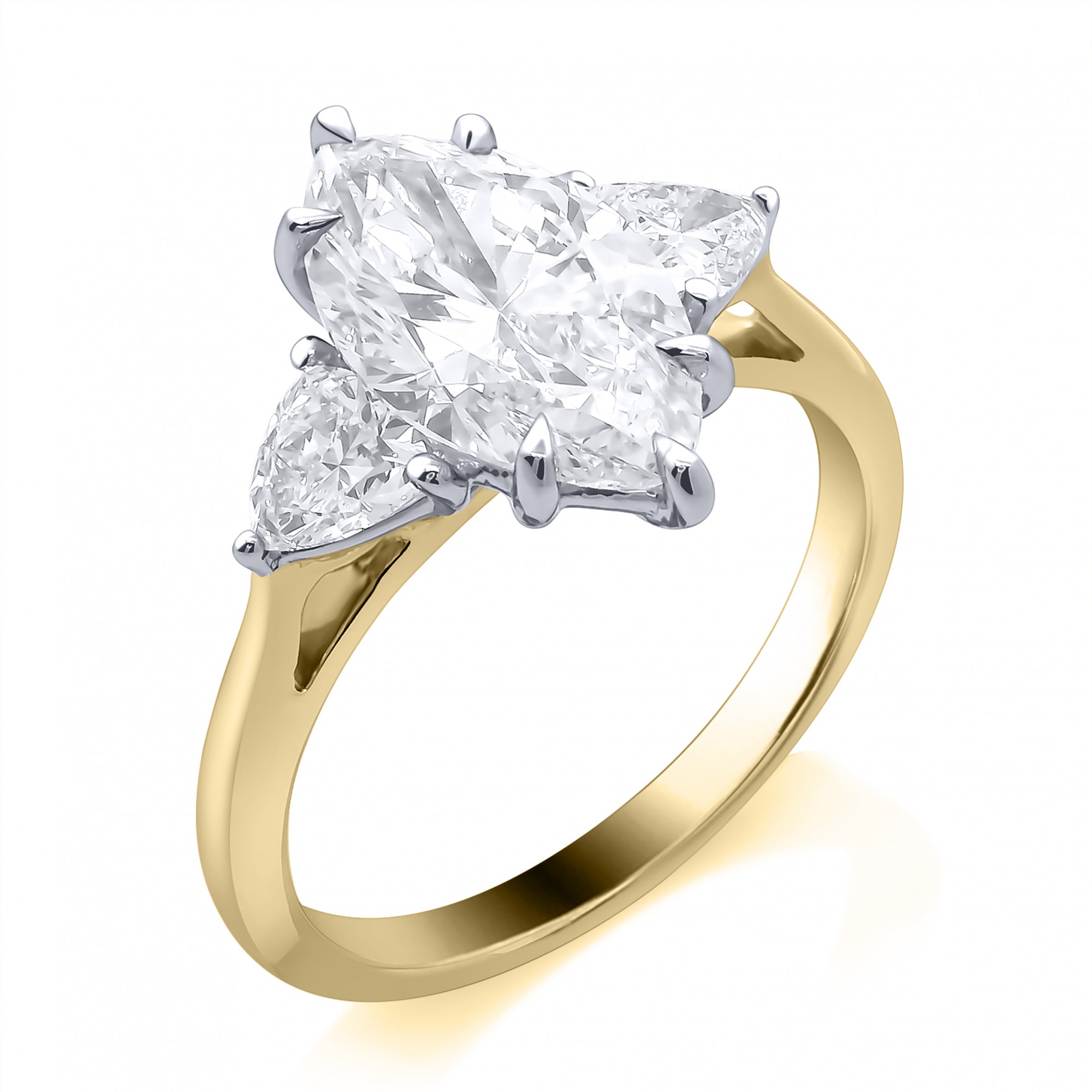 Marquise cut lab grown diamond with two trilliant cut side stones in a claw setting, mounted on a 18ct yellow gold ring. F. VS1 2.07ct.