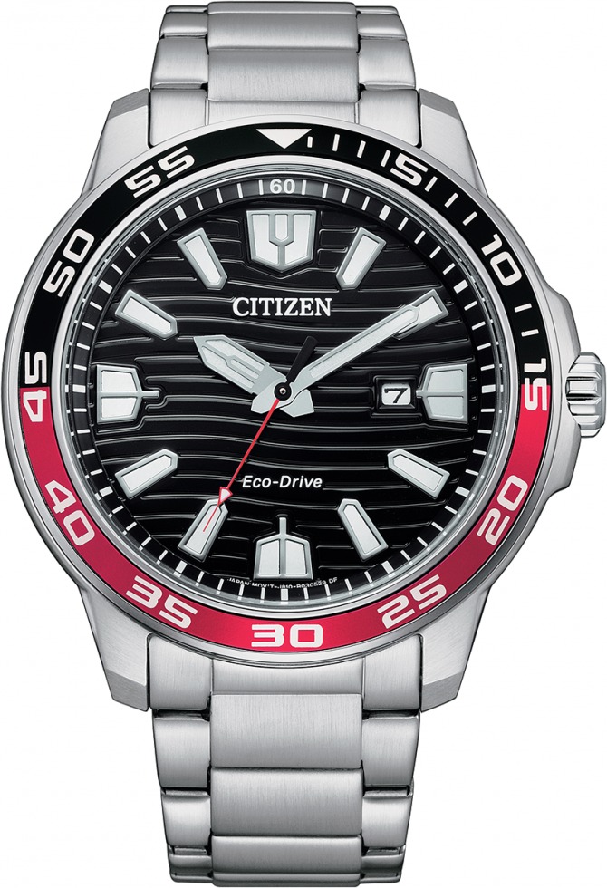 Stand out from the crowd with this Men's Sport from Citizen, featuring a black dial with a unique pattern offering a bold look. The look is completed with a daring black and red bezel and stainless steel bracelet. Date display, luminous hands and markers and water resistance to 100 metres. Featuring with Eco-Drive technology, this watch is powered by light and never needs a battery.