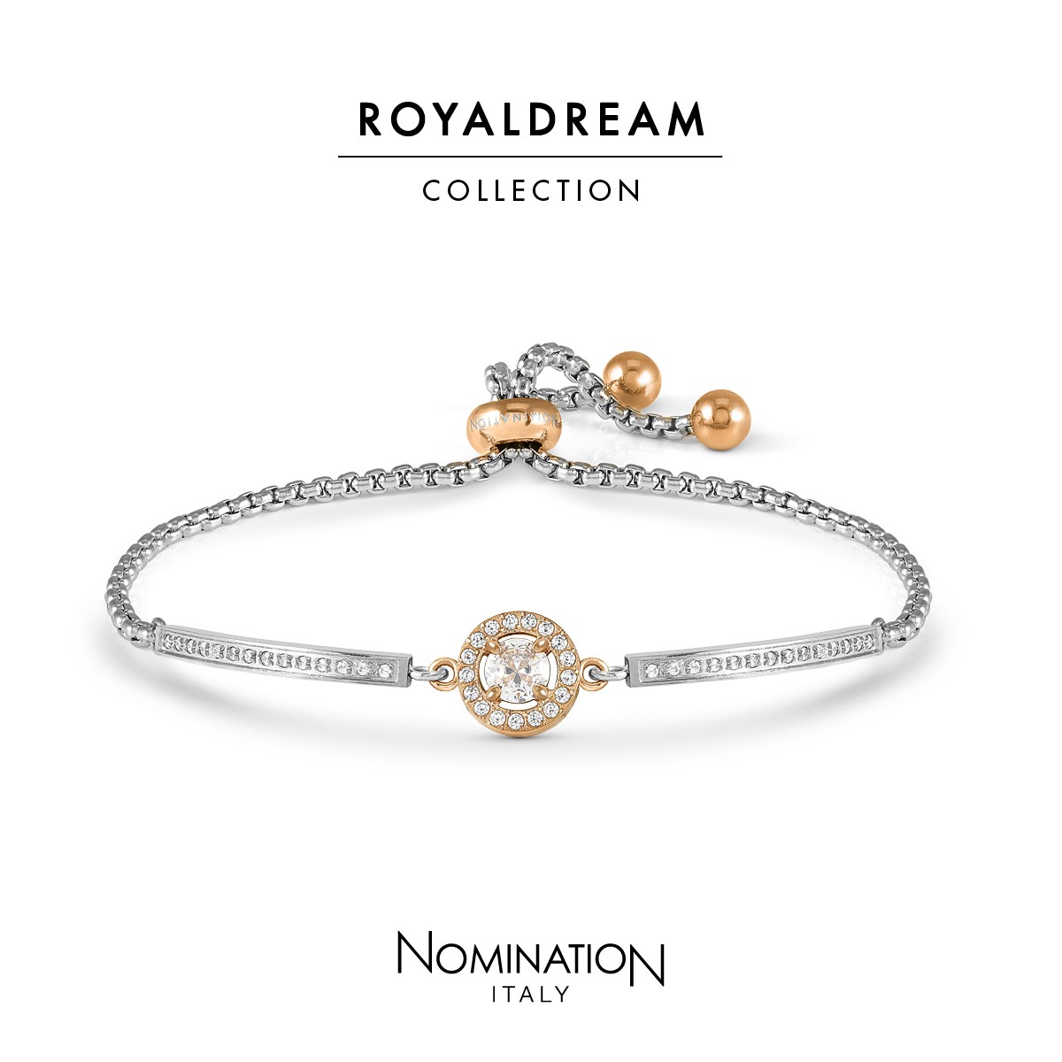 RoyalDream from Nomination - Rose gold plated stainless steel with white cubic zirconia round adjustable bracelet.