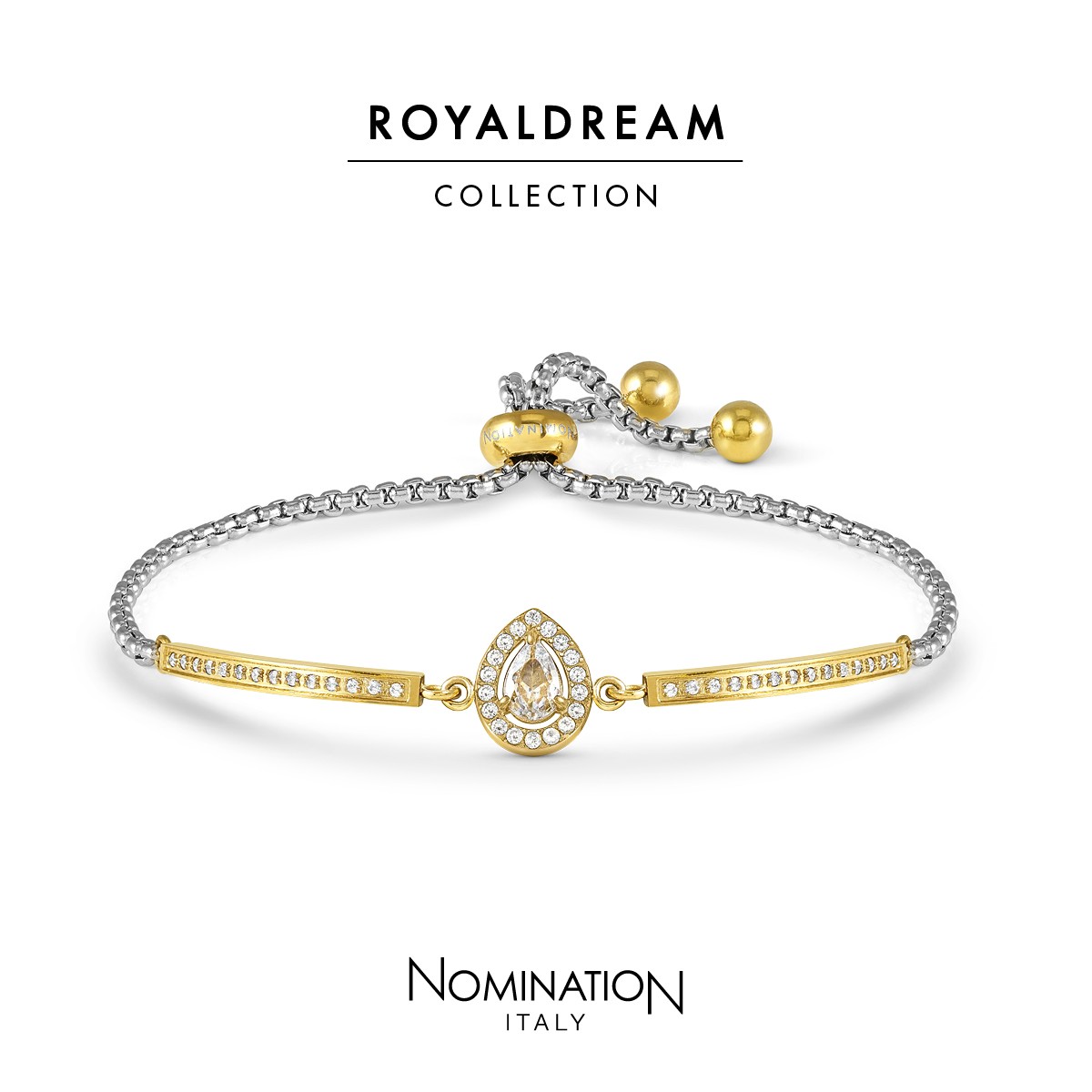RoyalDream from Nomination - Gold plated stainless steel with white cubic zirconia teardrop adjustable bracelet.