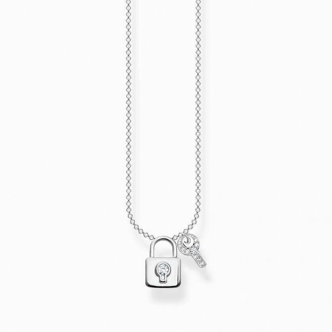 The accessory is made from 925 Sterling silver, the delicate necklace for women has an individually adjustable length up to 40, 42,5 and 45 cm. Both, the lock and the key are embellished with a white zirconia stone.