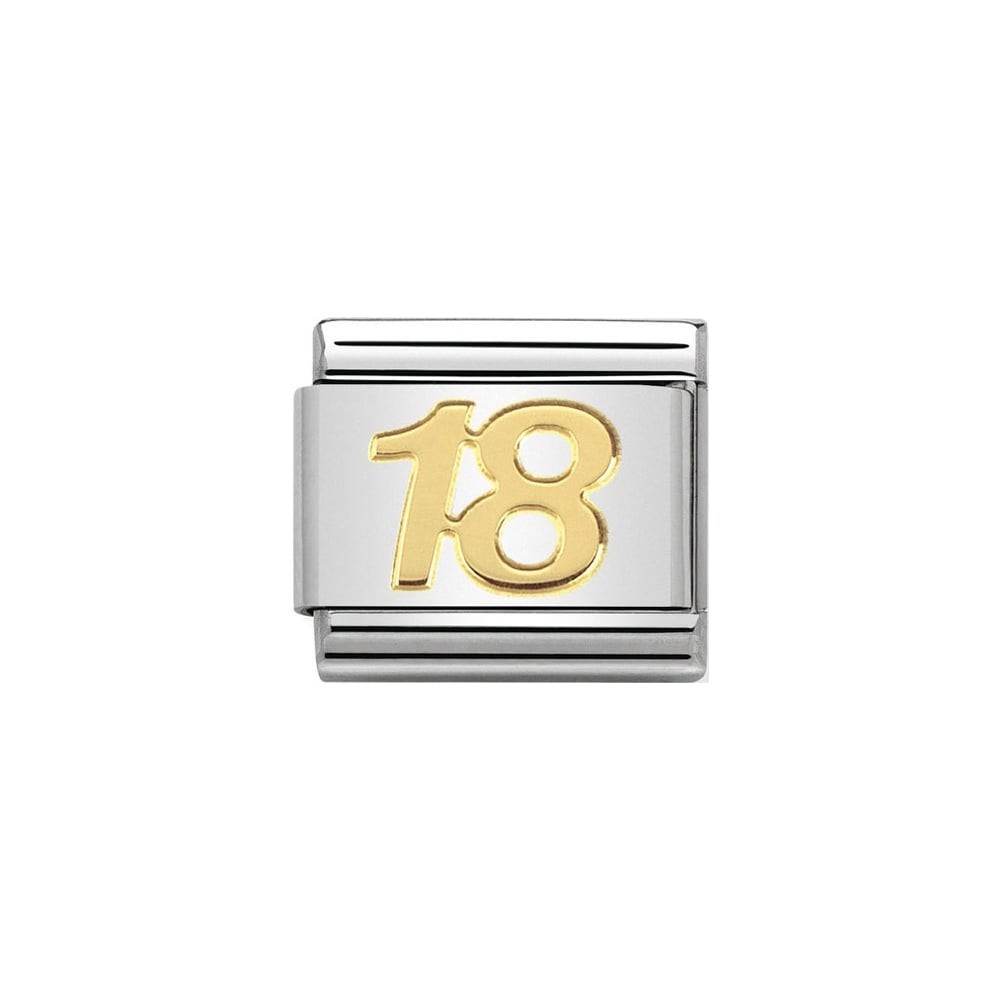 Original Charm in stainless steel and bonded yellow gold for Nomination's Composable Classic Bracelet with the Number 18. Made in Italy. This symbol represents the age of majority in a lot of countries. The perfect gift for a loved one's 18th birthday.