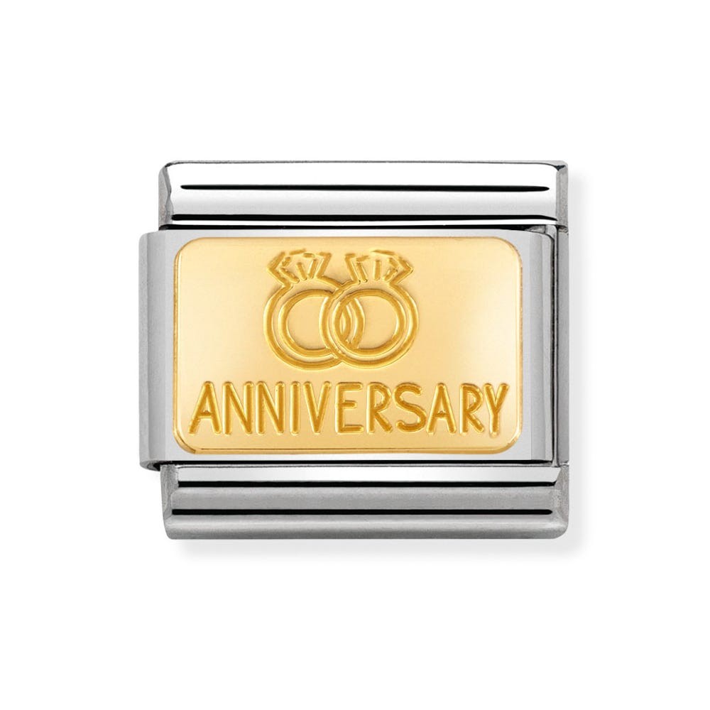 Original Charm for Nomination's Composable Classic bracelet in stainless steel and 18K gold with Wedding Rings and “Anniversary” written out. Made in Italy. Reaffirm your true love by adding this wedding bands and anniversary Charm to your bracelet.