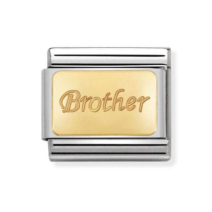 Charm for the Original Composable Classic bracelet with “Brother” engraved in stainless steel and bonded yellow gold. Made in Italy. Brotherly love is a bond that can't be broken!