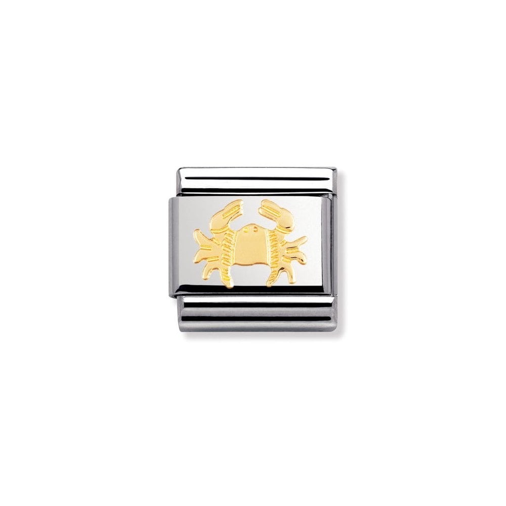 Original Zodiac Charm for Nomination's Composable Classic Bracelet with Cancer symbol in stainless steel and bonded yellow gold. All Zodiac symbols are available. Made in Italy. Cancer is a water sign: Sensitive, friend-oriented, practical.