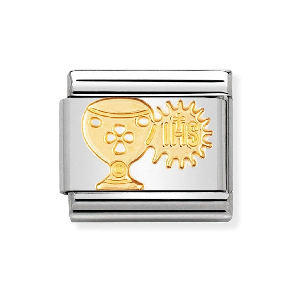 Nomination Original Charm for Classic Composable Bracelet with Religious Chalice and Host symbols in stainless steel and bonded yellow gold. Made in Italy. The perfect Holy Communion gift.