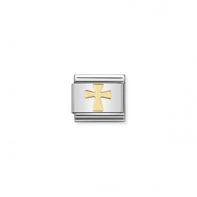 Nomination Original Charm for Classic Composable Bracelet with Religious Cross symbol in stainless steel and bonded yellow gold. Made in Italy. Celebrate your spiritual side. A beautiful charm to mark an occasion such as a First Holy Communion or Confirmation.
