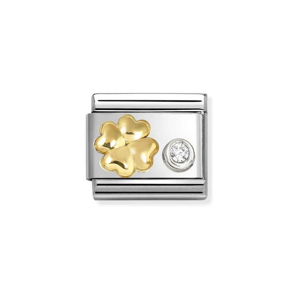 Original Nomination Composable Classic Link for Composable bracelet in stainless steel with bonded yellow gold Four-Leaf Clover symbol and a single Cubic Zirconia set in sterling silver. Add this Link to your bracelet for a touch of everyday magic. Carefully designed to bring that touch of good luck that sets every day on the right track. Choose this Link for its pretty design and the irresistible mix of the highest quality of stainless steel, gold and silver.