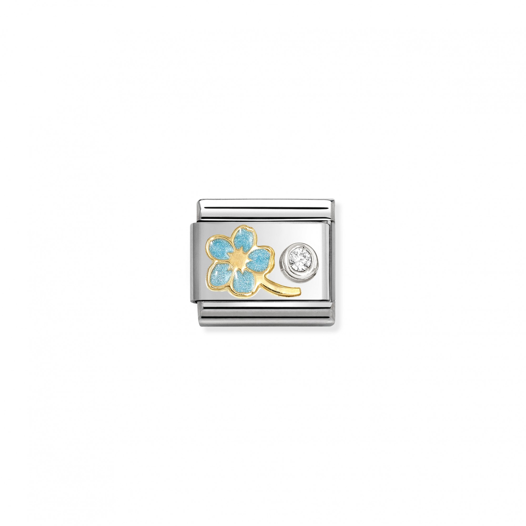 Original Nomination Composable Classic Link for Composable bracelet in stainless steel with bonded yellow gold Forget-Me-Not symbol with Blue enamel and a single Cubic Zirconia set in sterling silver. Discover how a unique Link can transform your Look daily with just a touch of colour, vibrance and sparkle.