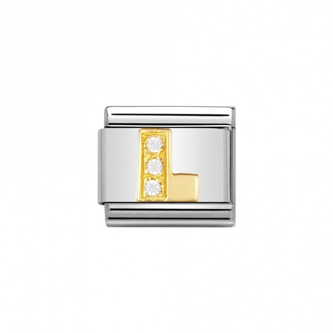 Classic Charm for Original Nomination Composable Bracelet with all Alphabet symbols in stainless steel, bonded yellow gold and Cubic Zirconia. Made in Italy. The perfect birthday gift.