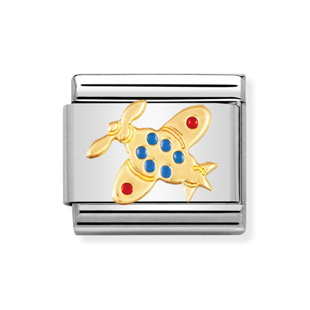 Original Charm for Nomination's Classic Composable Bracelet with Aeroplane symbol in stainless steel, bonded yellow gold and enamel. Made in Italy. Add your passions to your bracelet.