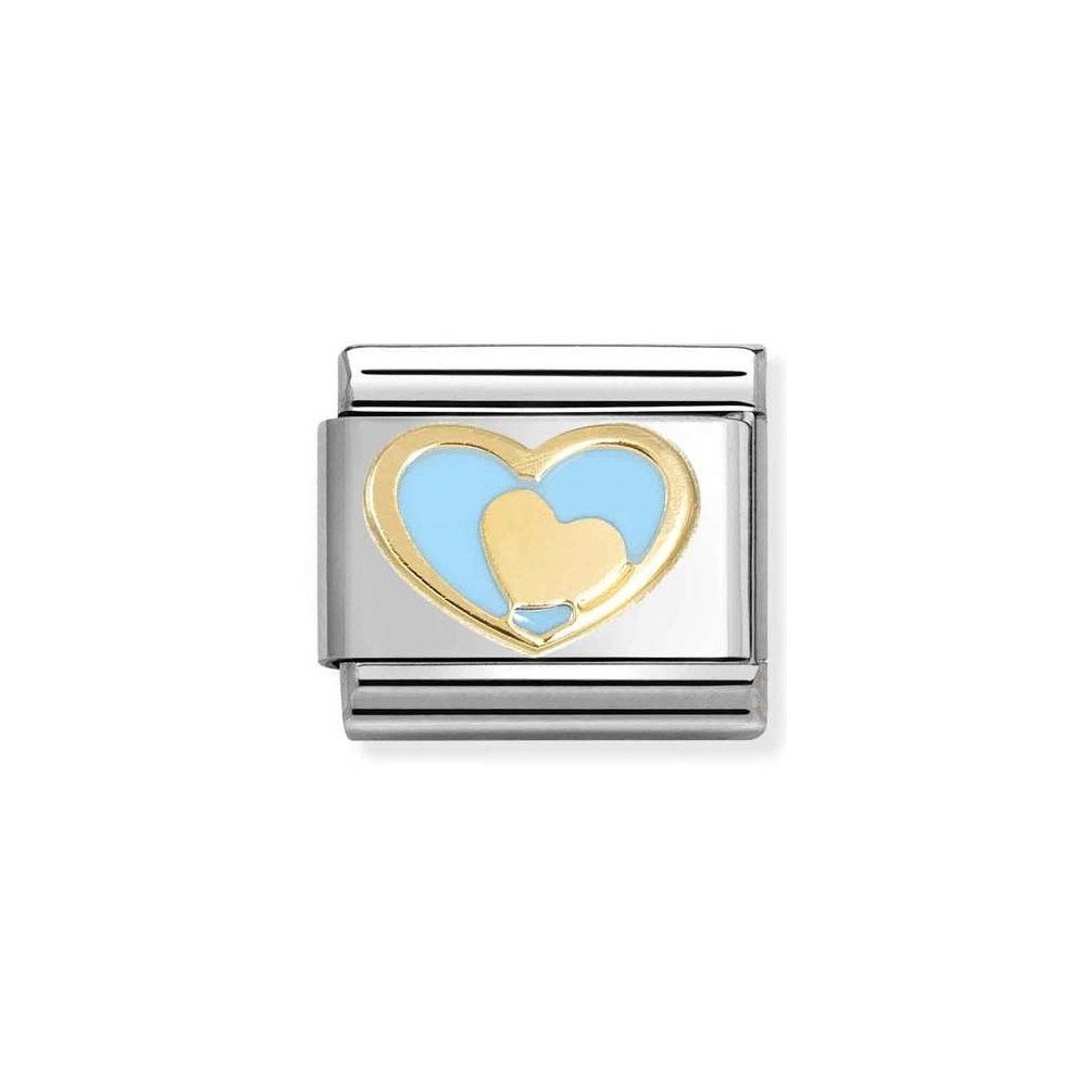 Original Nomination Composable Classic Link for Composable bracelet in stainless steel with bonded yellow gold Blue Heart-Gold Heart symbol with Blue enamel. This Link captures that sentiment of undying love and is the perfect way to celebrate a special bond.