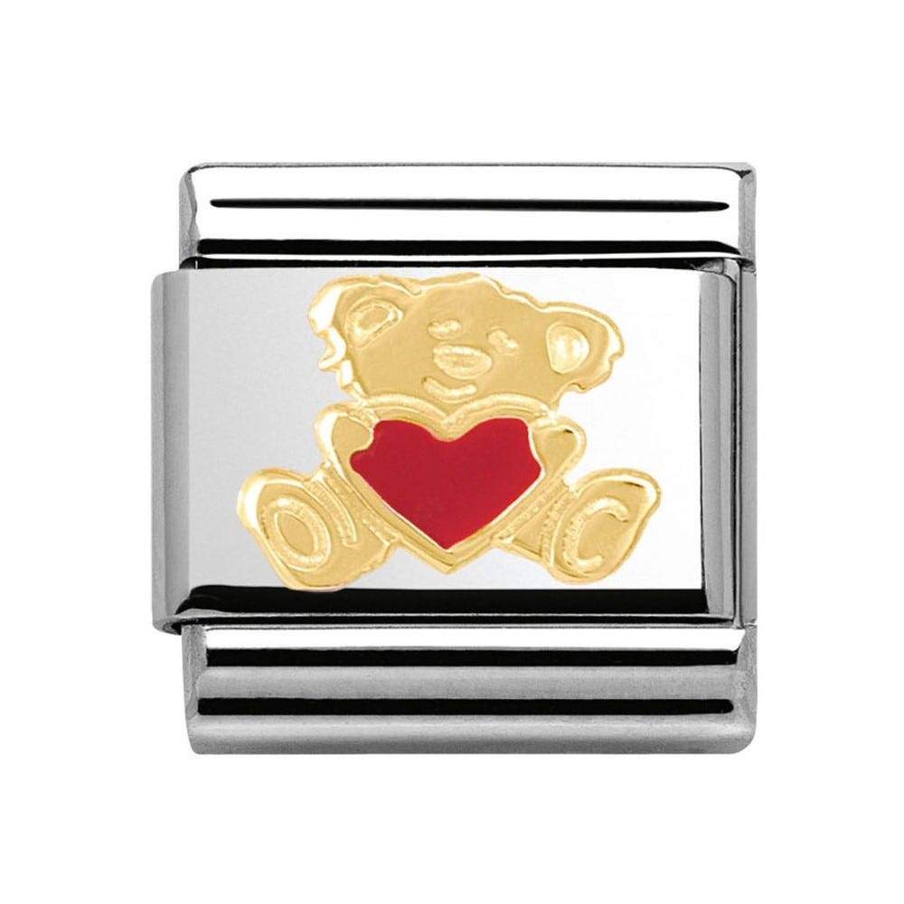 Original Charm in stainless steel, bonded yellow gold and enamel for Nomination's Composable Classic Bracelet. Symbol of Teddy Bear with Heart. Made in Italy. Choose your favourite ode to love! The perfect Valentine's Day gift.