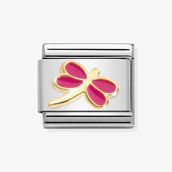 Original Nomination Classic Link in stainless steel and 18K yellow gold with Dragonfly symbol with Fuchsia enamel. Made in Italy. The Dragonfly Link is the perfect gift for the Nature lover - choose your favourite colour.