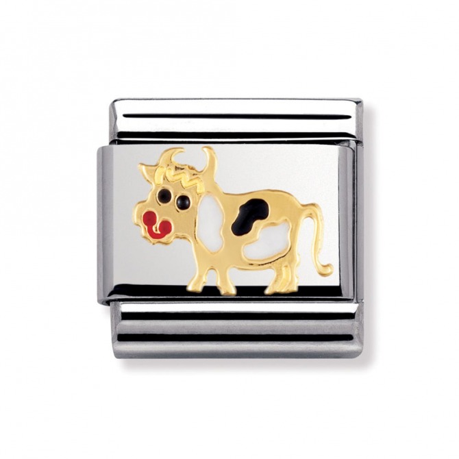 Original stainless steel Charm for Nomination's Composable Classic Bracelet with Animal symbols. Details in bonded yellow gold and enamel. Black and white Cow. Several versions are available. Made in Italy. The perfect gift for a friend who love farm life.