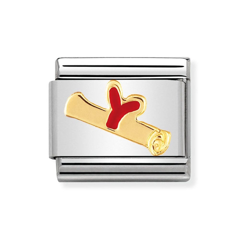 Nomination Original Charm for Classic Composable Bracelet with Graduate symbol in stainless steel, bonded yellow gold and red enamel. Made in Italy. The perfect graduation gift.