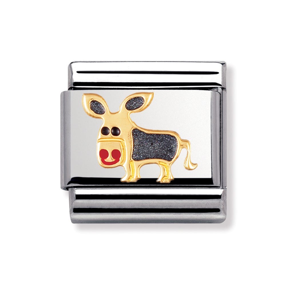 Original stainless steel Charm for Nomination's Composable Classic Bracelet with Animal symbols. Details in bonded yellow gold and enamel. Donkey. Several versions are available. Made in Italy. Add a precious Charm to your bracelet.