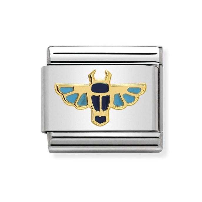 Original Composable Charm for the Classic size bracelet in stainless steel with Egyptian symbol in bonded yellow gold and enamel. Made in Italy. The Egyptian Scarab is a powerful amulet with magical abilities.