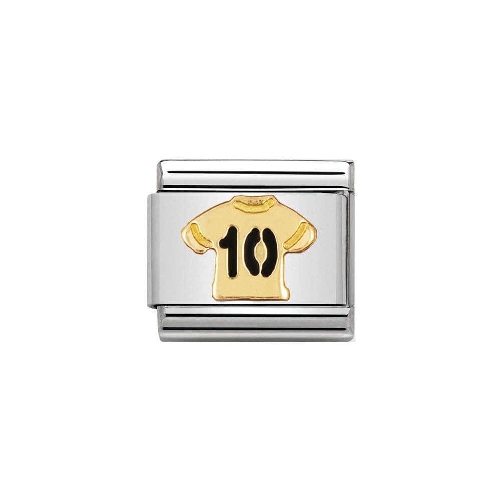 Original stainless steel Charm for Nomination's Composable Classic Bracelet with Sports symbol. Details in bonded yellow gold and enamel. Made in Italy. The jersey number represents you when you play with your team or alone. Add it to your bracelet and keep it with you always.