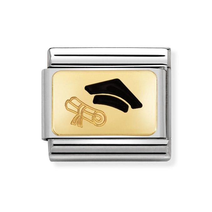 Charm for the Original Composable Classic bracelet with a Graduation Cap in stainless steel, 18K gold and black enamel. Made in Italy. Congratulations! You've earned your degree!