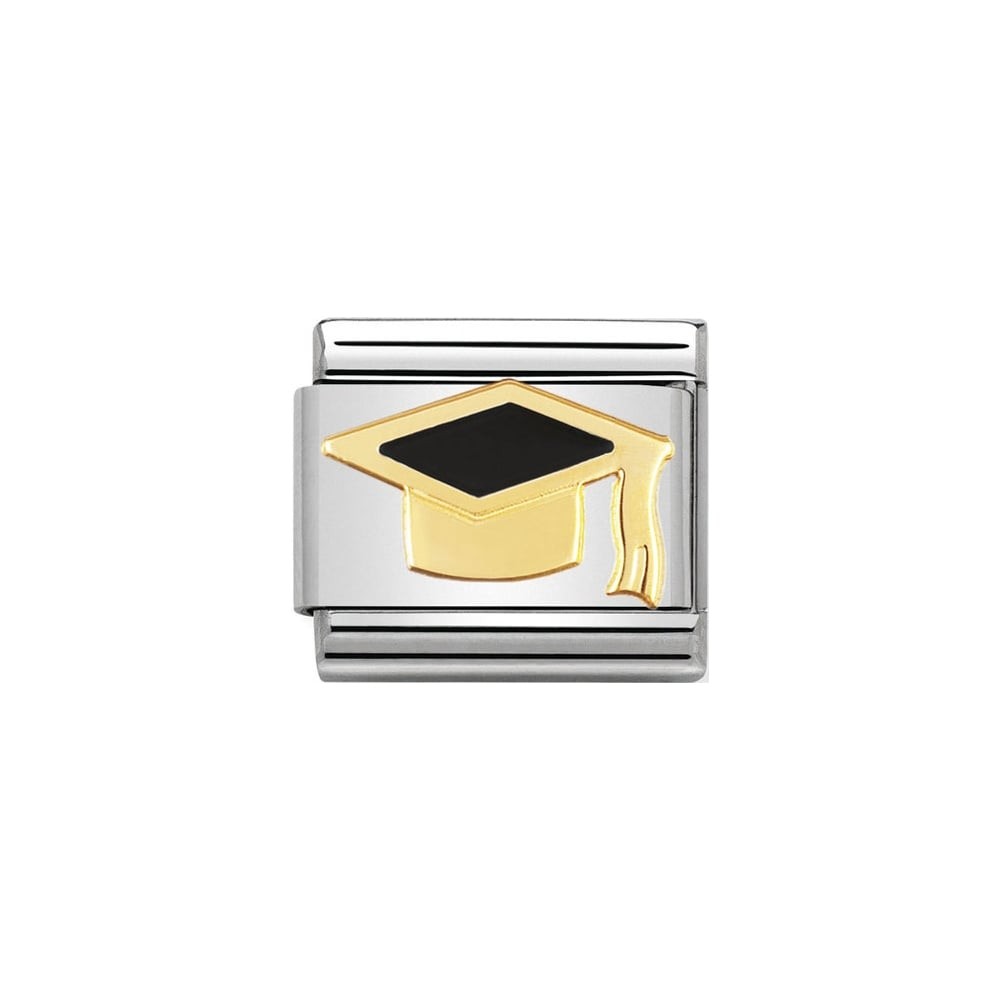 Nomination Original Charm for Classic Composable Bracelet with Graduate Hat symbol in stainless steel, bonded yellow gold and black enamel. Made in Italy. Celebrate your major accomplishment!