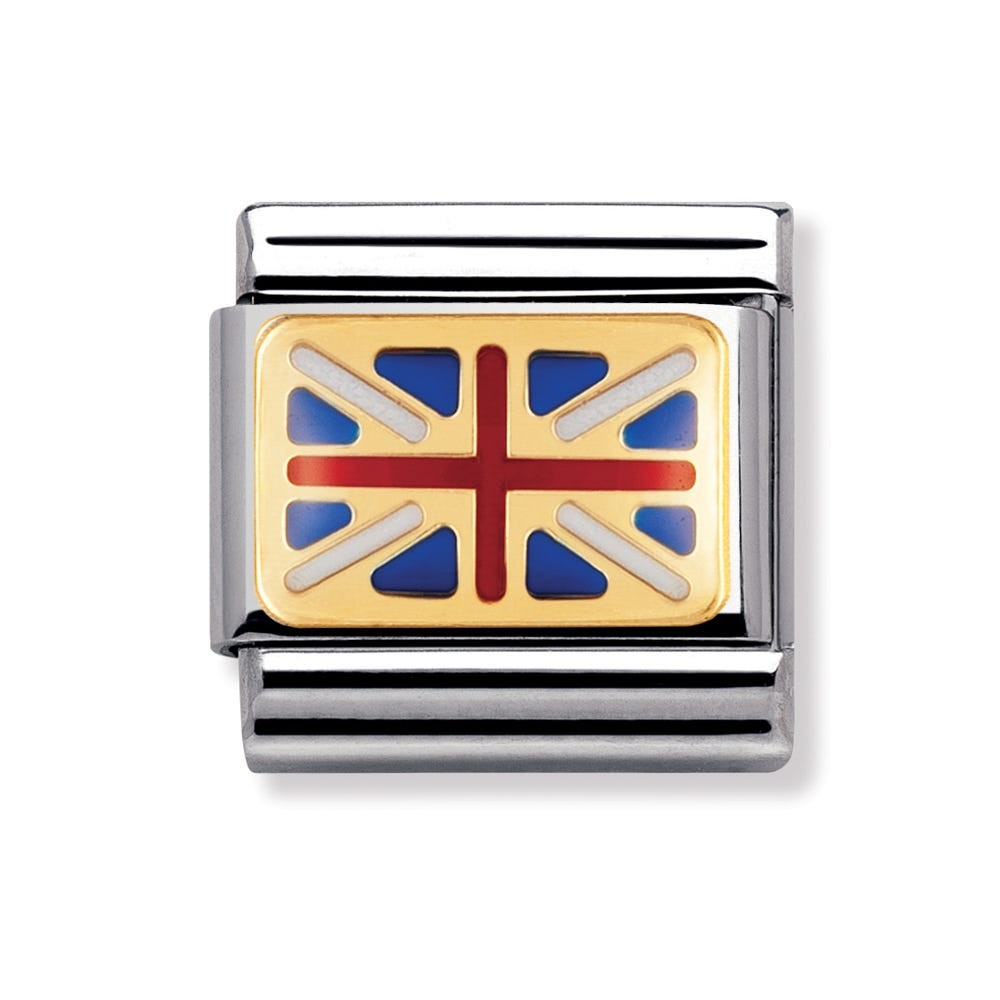 Original stainless steel Charm for Nomination's Composable Classic Bracelet with details in bonded yellow gold and enamel. Symbol of Great Britain Flag. Made in Italy. Customise the Charms on your bracelet to remember the fantastic places you've seen.