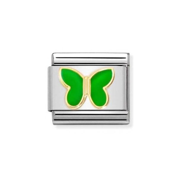 Original Nomination Classic Link in stainless steel and 18K yellow gold with Butterfly symbol with Green enamel. Made in Italy. This beautiful Green enamel captures the energy of this edition of the new edition of the Composable Classic Gold Collection - pure energy!