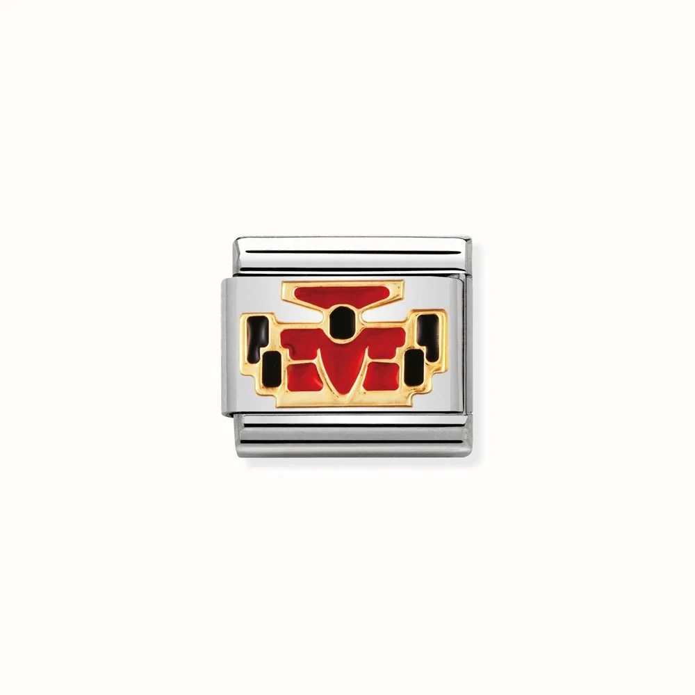 Original stainless steel Charm for Nomination's Composable Classic Bracelet with details in bonded yellow gold and enamel. Sports symbols: Formula 1. Made in Italy. Show your passion for Formula 1 with a unique Charm.