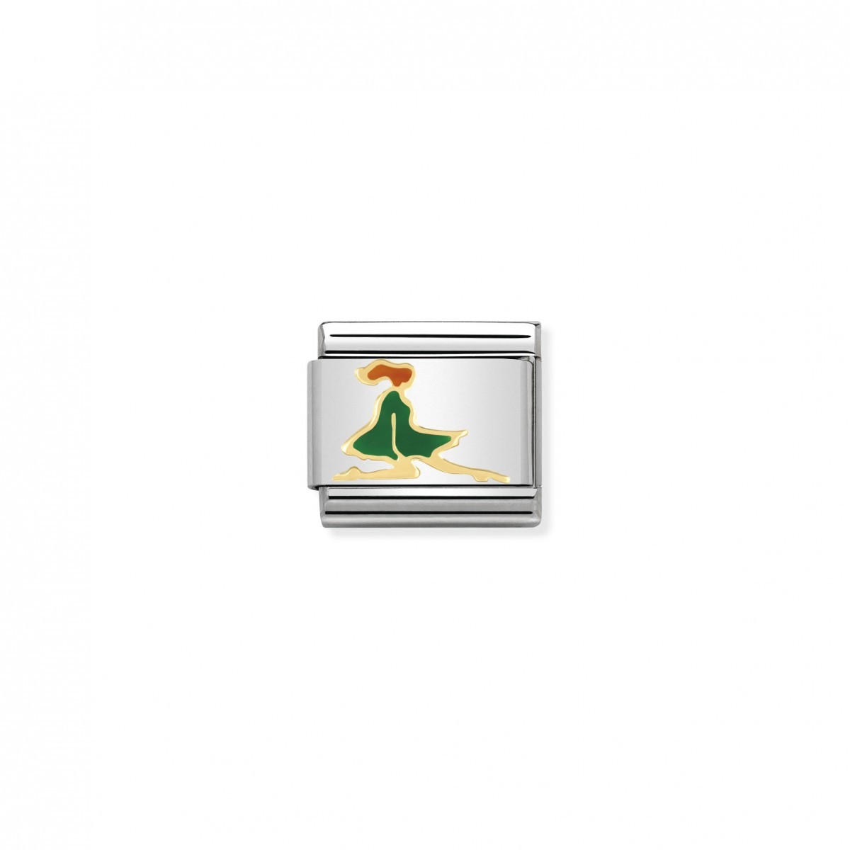 Original stainless steel Charm for Nomination's Composable Classic Bracelet with details in bonded yellow gold and enamel. Symbol of Irish dancer. Made in Italy. A beautiful way to show your passions.