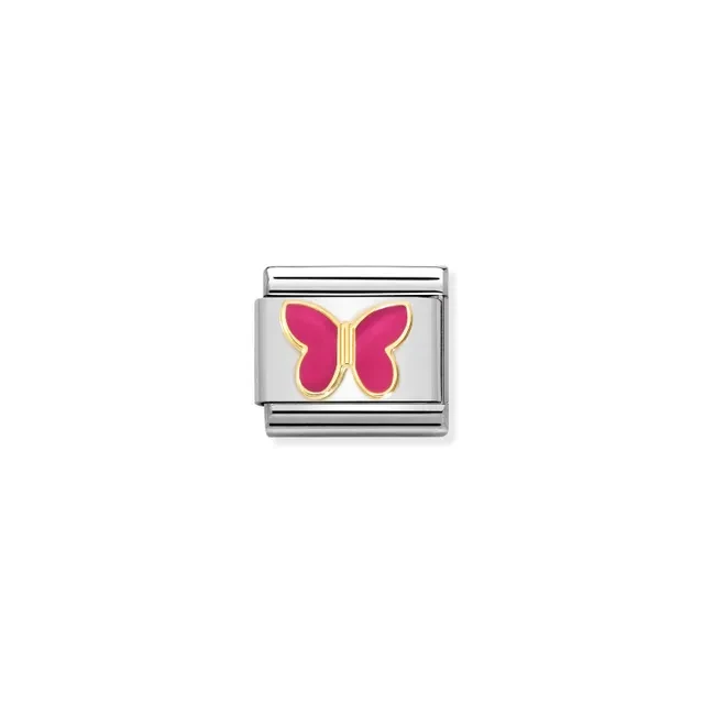 Original Nomination Classic Link in stainless steel and 18K yellow gold with Butterfly symbol with Fuchsia enamel. Made in Italy. This new edition of the Composable ClassicGold Collection has lively and colourful Links - choose your favourite symbol.