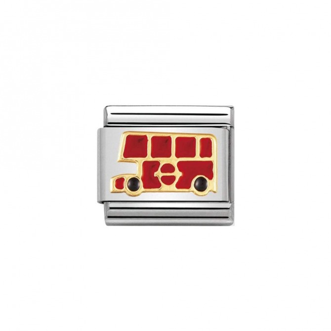 Original Transport Charm for Nomination's Classic Composable Bracelet with London Bus symbol in stainless steel, bonded yellow gold and enamel. Made in Italy. Choose your most precious souvenir of a great trip.
