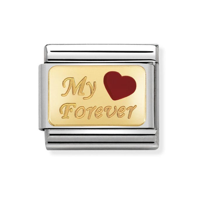 Charm for the Original Composable Classic bracelet with “My Forever” engraved with a Heart in stainless steel, 18K gold and red enamel. Made in Italy. Celebrate your true love forever!