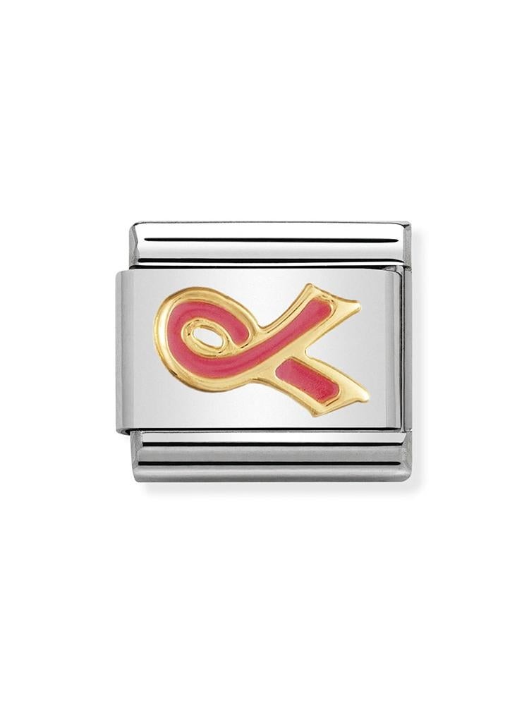 Original Charm for Composable Classic Nomination Bracelet with Pink Ribbon symbol in stainless steel, bonded yellow gold and pink enamel. Made in Italy. Show your support in the fight against cancer.
