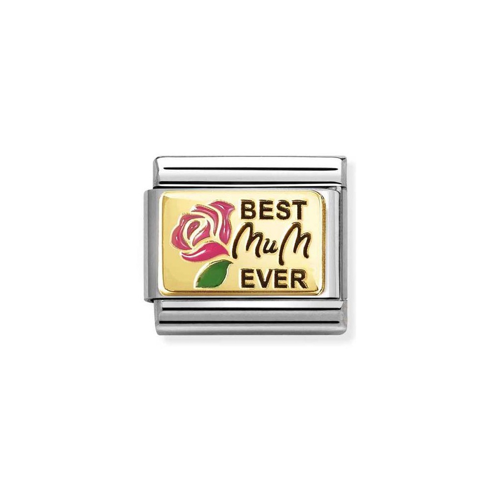 Original Nomination Classic Link in stainless steel and bonded yellow gold decorated plate with BEST MUM EVER in black enamel and Rose with pink and green enamel, applied by hand. This Link is the perfect gift for Mother's Day.