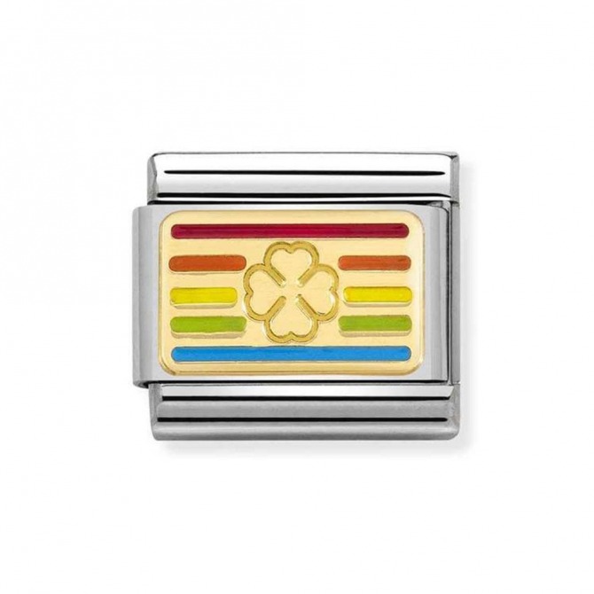 Original Nomination Link for Composable Classic Bracelets in stainless steel and bonded 18ct yellow gold with coloured enamel Rainbow Flag Four-Leaf Clover. Made in Italy. This Link is the perfect way to combine full spectrum colour with Good Fortune.