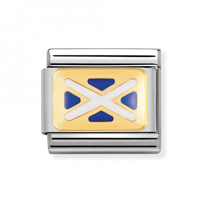 Original stainless steel Charm for Nomination's Composable Classic Bracelet with details in bonded yellow gold and enamel. Symbol of Scottish Flag. Made in Italy. Personalise your bracelet as a memory of the most important trip of your life.