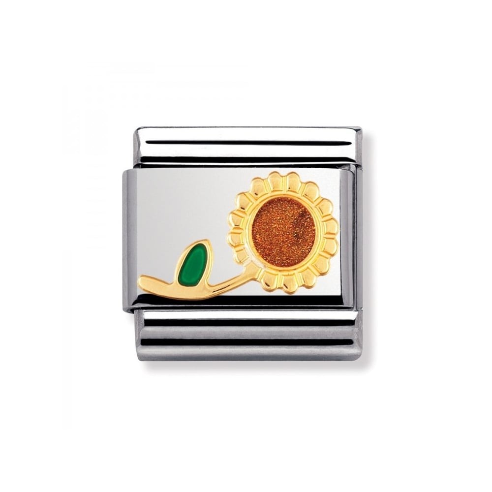 Original stainless steel Charm for Nomination's Composable Classic Bracelet with details in bonded yellow gold and enamel. Sunflower. Several Flower Charms are available. Made in Italy. Brighten up your day with a sunflower Charm.