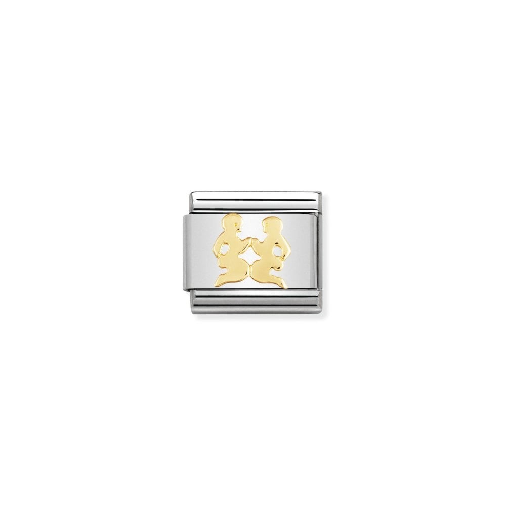 Original Zodiac Charm for Nomination's Composable Classic Bracelet with Gemini symbol in stainless steel and bonded yellow gold. All Zodiac symbols are available. Made in Italy. Geminis are dynamic and are known to have many talents.