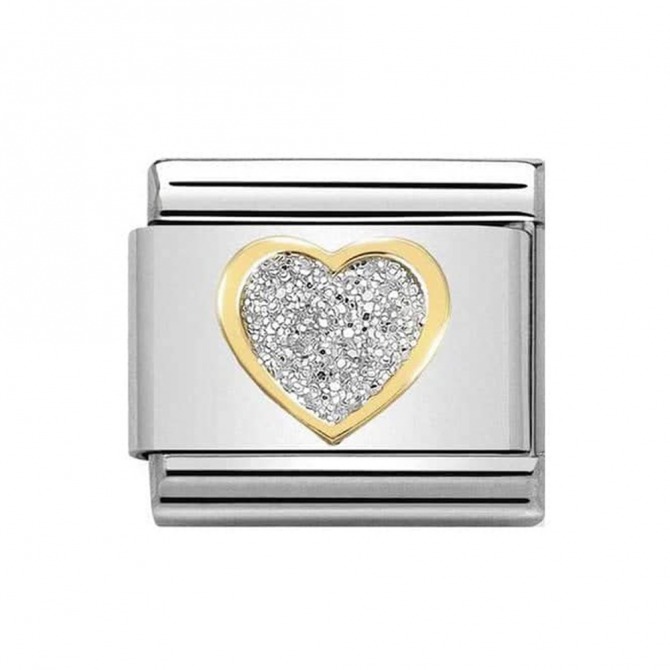 Original Nomination Link for Composable Classic Bracelets in Stainless steel with Heart symbol with glitter enamel and bonded yellow gold. Made in Italy. This Link has the symbol that has so many meanings for so many - a heart!