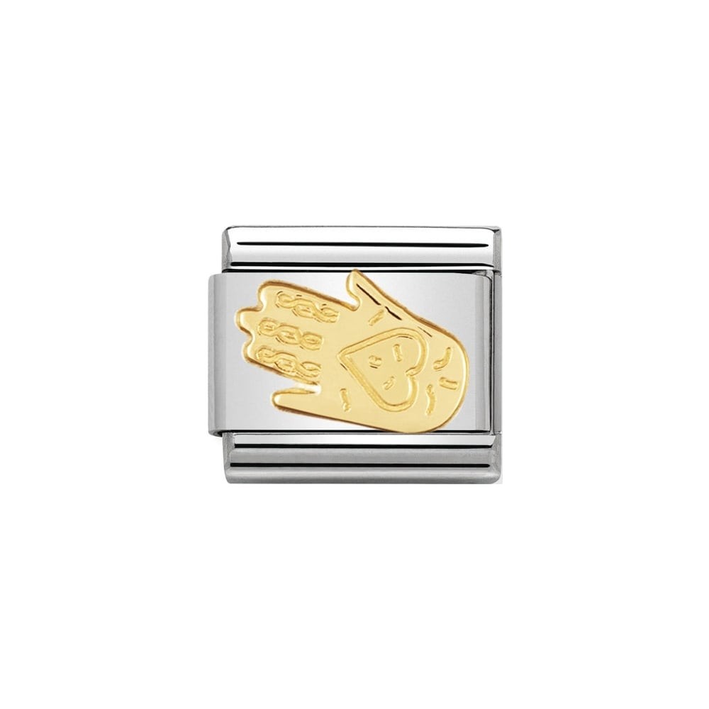 Nomination Original Charm for Classic Composable Bracelet with Religious Hand of Fatima symbol in stainless steel and bonded yellow gold. Made in Italy. Celebrate your spiritual side.