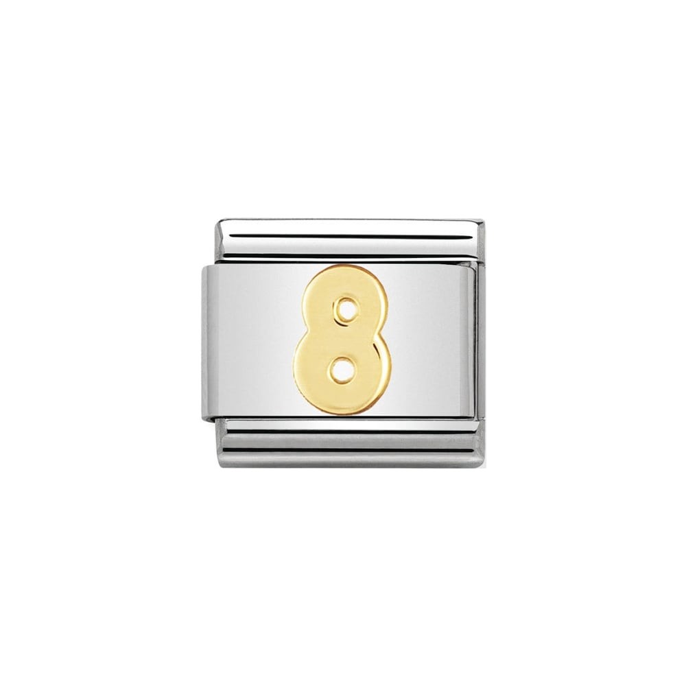Original Charm for Nomination's Composable Classic Bracelet with Number 8 in stainless steel and bonded yellow gold. Available Charm versions: 0-9. Made in Italy. The perfect birthday gift.
